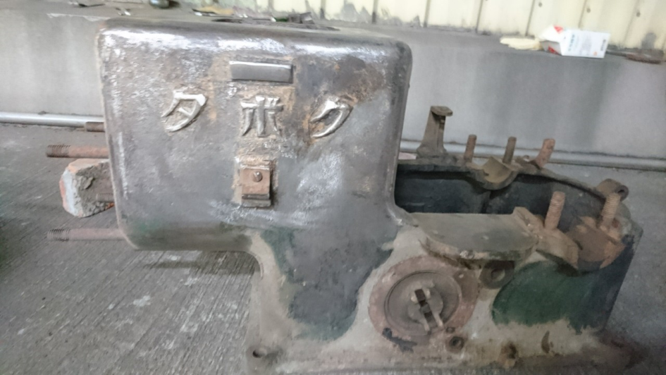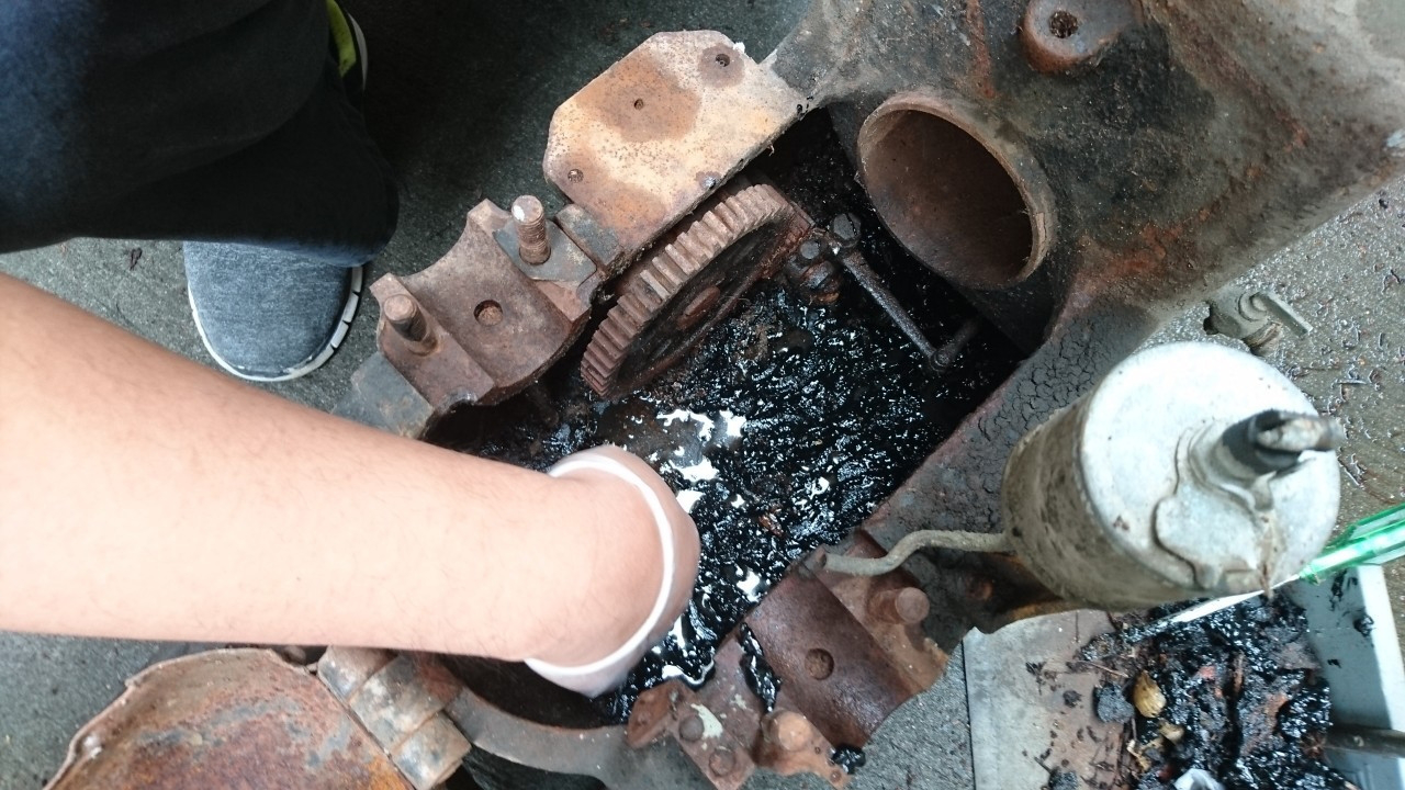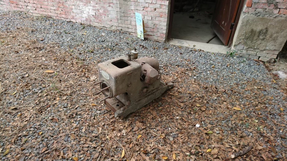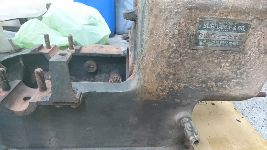 表面有大量鏽蝕,曲軸箱因為長年沒有使用,當時在裡面潤滑用的油,已經變成油泥附著在內部,水箱內部也因長年沒有使用,導致內部有大量的泥土、樹葉和樹枝,木頭的底座也因為泡水開始腐爛。